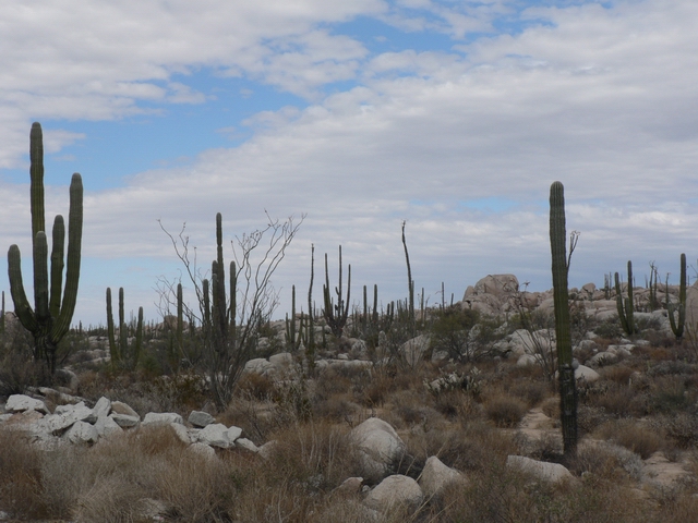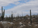 Farther south, the scenery became very much like the deserts of Arizona. Endless fields of gigantic cacti all around (only more and much bigger than those in Arizona). The noteworthy event of the day was our first off-roading experience. The AAA guide wasn't exaggerating: Mex 1 is a very narrow road with either none or very steep and sandy shoulders. As we parked on one of them for a picture of the oversized cacti, an error in judgment nearly left our Nissan lying on a side. The inclination of the shoulder was probably close to 40 degrees, and our options were rather limited: either to slide deeper into the ditch, or possibly even tip onto the side. Thanks to the 4WD, our first off-roading attempt had a happy ending. Luckily, we hadn't decided to take our old Honda Civic to this trip We promise to be more careful next time we get off the road.